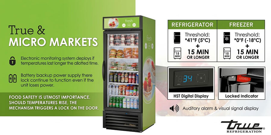 On these True merchandisers, the Health Safety Timer feature is an electronic monitoring and door-locking function tied to cabinet temperature. The purpose is straightforward: if the cabinet stays above a defined threshold for too long, the unit can lock the door and alert staff rather than continuing to allow product access as if nothing happened.
