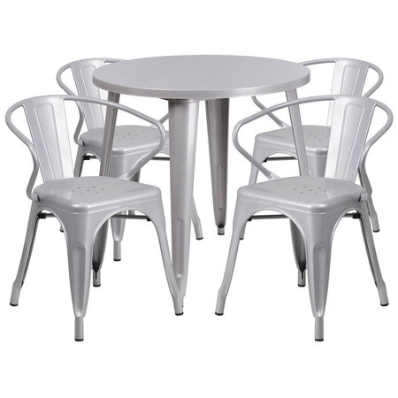 Flash Furniture CH-51090TH-4-18ARM-SIL-GG, 30" Round Top Indoor / Outdoor Steel Cafe Dining Set w/ 4 Arm Chairs, Silver