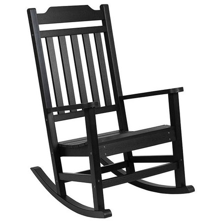 Take a break from your day and hang out on your front porch, patio or deck in this all-weather black poly resin rocking chair. No matter your decorating style, the traditional slat back and seat design give a classic but on-trend look to this colorful rocking chair. The full-back design will support you in all the right places while the sloping runners provide smooth rocking motion to keep you cozy and relaxed.