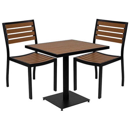 This set includes a 30" x 30" poly slatted square table with a steel base and 150 lbs. static weight capacity to hold those al fresco dinners, board games and pool accessories with ease. This patio set is weather and rust resistant so you won't need to move it or put it away when the seasons change. The faux teak slats pair nicely with the black powder coated frame finish to create a sophisticated look for your outdoor space. Fixed plastic floor glides will allow the set to move easily and the set cleans easily with a water based cleaner for easy maintenance.