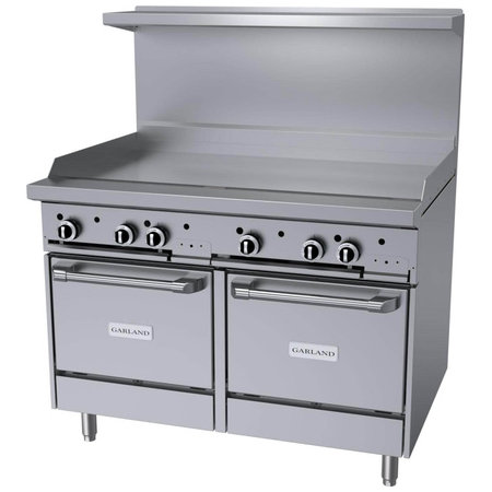 Garland G48-G48LL, Gas Restaurant Range w/ 48" Manual Griddle, 2 Space Saver Ovens, 136,000 BTU