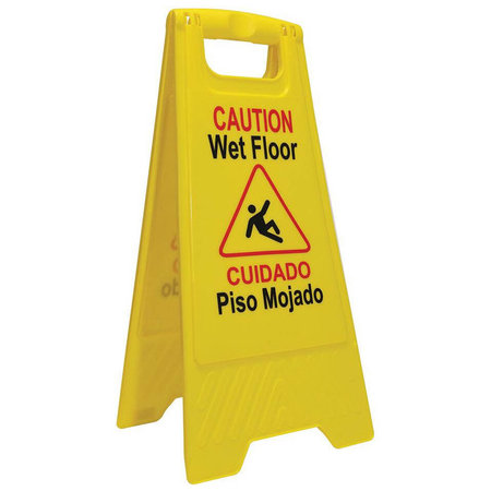 - Bright yellow floor sign communicates the necessary warning in English and Spanish to help maintain safety