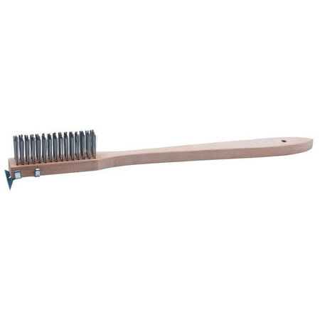 Wire cleaning brush with scraper, wood handle, 20" overall length.