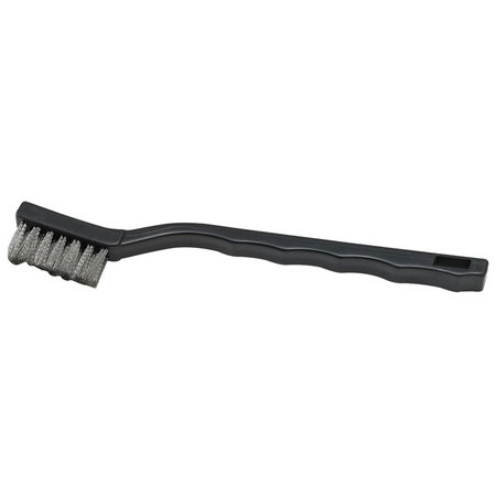 Wire cleaning brush with scraper, stainless steel wire bristles, 7" overall length.